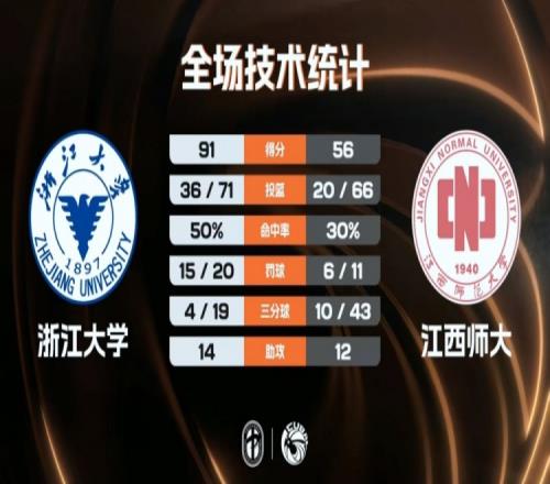 次节回来,史磊率先命中三分球,但这并没有改变江西师大进攻乏力的情况,虽然浙江大学本节命中率急剧下滑,单节得分也未能达到20分,但江西师大还是输了4分,半场结束,浙江大学51-24领先江西师大。