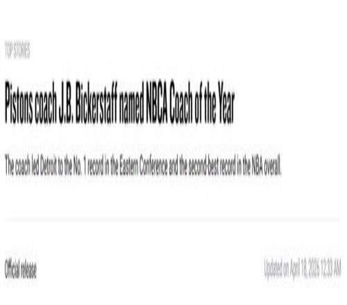 “J.B.比克斯塔夫完全配得上这份同行授予的至高荣誉。本赛季,他极致诠释了教练职业的初心与坚守。不仅带领活塞打出队史顶级赛季,更被同行推举为协会第六任会长。祝贺比克斯塔夫教练、活塞助教团队及整支俱乐部,斩获本届迈克尔-H-戈德堡年度最佳教练奖。”