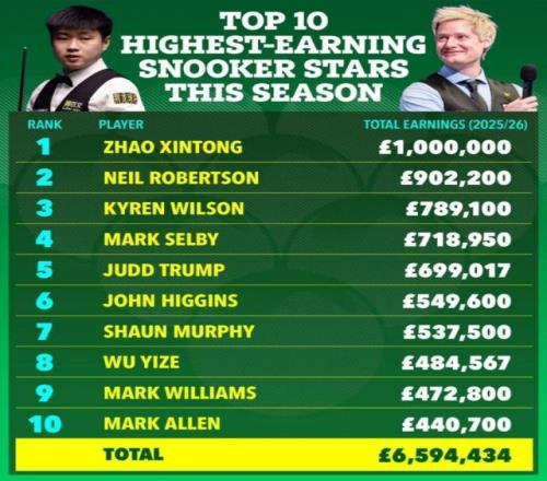 2025/26赛季斯诺克奖金收入排行榜:赵心童100万英镑位列第一