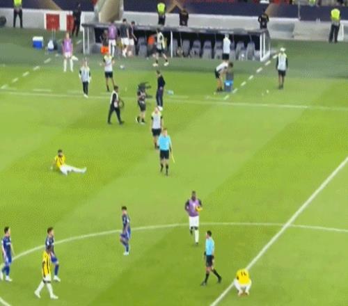 而赛后,或许是对出局结果的失望,又或者对当值主裁马宁判罚的不满,吉达联合队的20号后卫艾哈迈德·沙拉赫利,冲进球场愤怒靠近马宁,随后从身后用胸口冲撞了马宁的背部,不仅如此,他嘴里还叫骂着,态度十分嚣张。